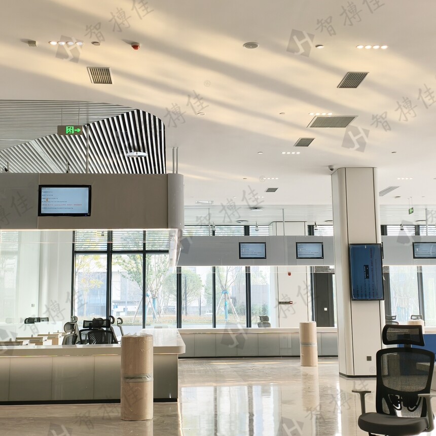 窗口显示屏:信息透明与效率提升 窗口显示屏实时显示叫号信息、窗口状态及服务指南,提升服务透明度。在智慧政务大厅中,显示屏与自助终端、导览系统联动, 形成信息共享网络,优化空间布局,减少拥堵。职员通过显示屏后台处理数据,提高工作效率。
